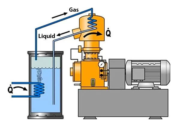 The FCL is placed in a bath (cryostat) with liquid that is at equilibrium (saturation temperature). Heat production of the FCL like AC losses and thermal load of the cryostat will cause the liquid to boil. The evaporated gas rises to the top of the cryostat where the Cryogenerator is connected. The boil off gas is returned to the cold head where it is reliquefied and fed back to the cryostat bath by gravity. This set-up is visualized below: